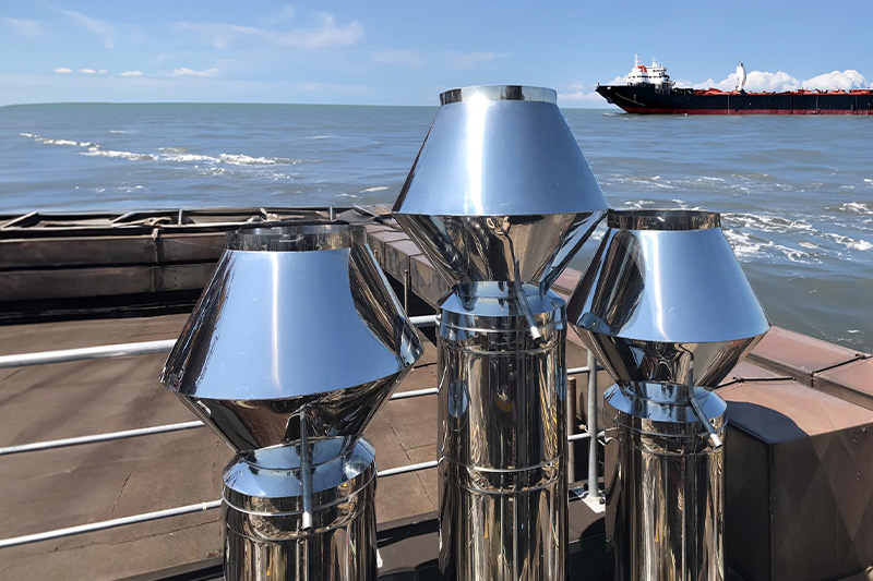 Stainless steel flue systems for the marine sector must be particularly corrosion-resistant, which is why materials such as stainless steel 1.4404 (AISI 316L) are used, known for their resistance to seawater. These systems are designed to withstand temperatures up to 1112°F and pressures of up to 20” W.C.. Additionally, they must endure mechanical stresses, such as vibrations, and allow for stress-free thermal expansion.