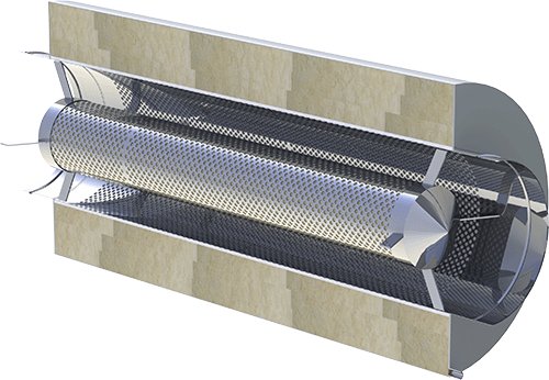 All Jeremias absorption silencers are filled with non-flammable mineral wool. In order to protect these from fibers being discharged by the exhaust gas flow, a protective fleece is often incorporated between the perforated plate and mineral wool. Depending on the composition of the exhaust gases and the operating conditions, different materials are used to protect the mineral wool: