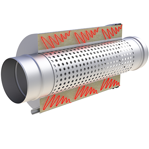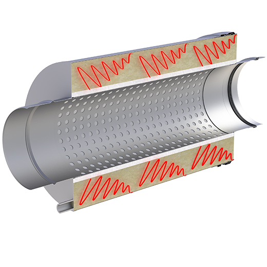 Mufflers that work according to the absorption principle achieve a reduction in noise, especially in the medium and high frequency range, through the use of open-pored, sound-absorbing material, e.g. mineral wool. The sound waves from the exhaust flow reach the mineral wool behind it through an internal perforated plate, where they are absorbed and the sound energy is converted into heat due to friction effects.